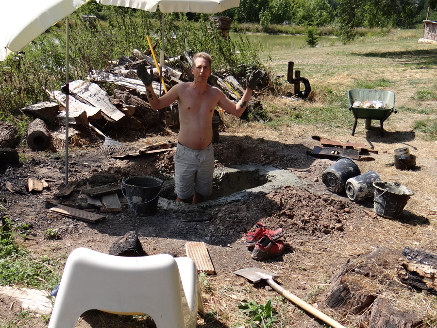 Ebenfalls dort am See liegt die Feuerstelle. Erst war sie noch von Brennnesseln umrankt sowie wild, gestapeltes Nagelholz lag rum und mittendrin ein Berg Asche mit noch mehr Nägeln. Es galt also zuerst den Platz zu erobern, wobei wir ordentlich aufräumten. Insbesondere hatte der Chris Lust, da zu feuern und dann auch zu graben.