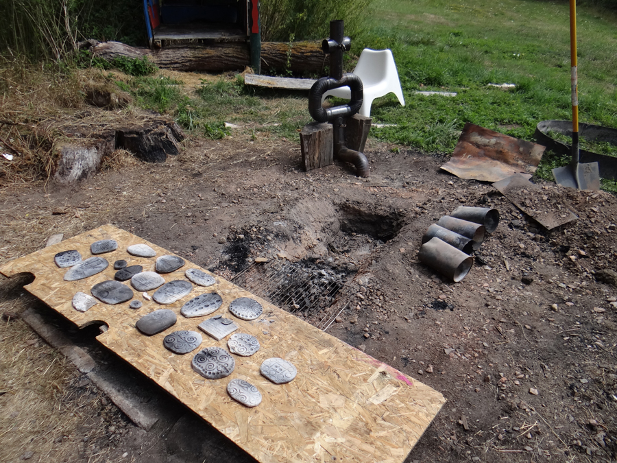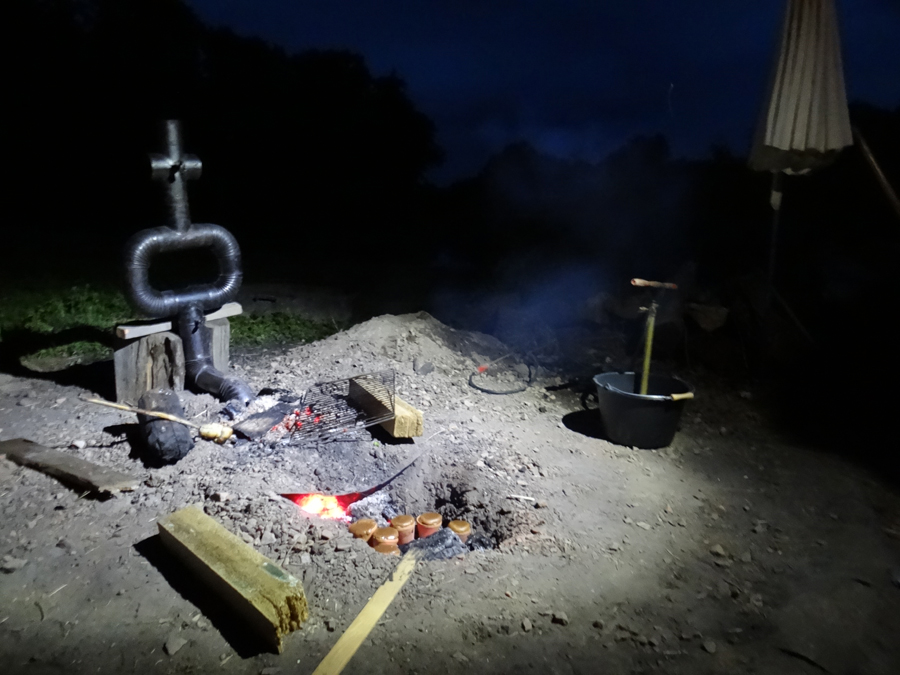 Danach mussten die Fliesen noch trocknen, weshalb wir sie zwischenzeitlich im super heissen Fou-Gewächshaus zwischenlagerten. Darauf folgten die Brennvorgänge. Technisch war die schwarze Färbung unsere Herausforderung. Der Chris-Ofen lief praktisch automatisch und diente gleichzeitig als Grill für das Blood-Moon-Dinner. An der Form der Kaminrohre kann man ablesen, dass wir zwei Mal das Experiment durchgeführt haben.
